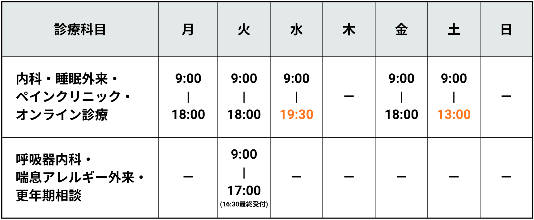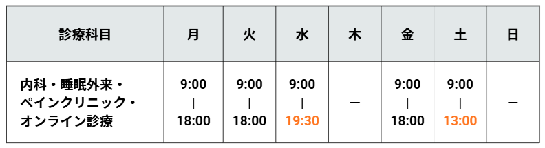 ※木曜、日曜祝日休診 【内科・睡眠外来・ペインクリニック・オンライン診療】 月 9:00~18:00 火 9:00~18:00 水 9:00~19:30 金 9:00~18:00 土 9:00~13:00 ※内科・ペインクリニック往診(ご自宅、宿泊施設への出張診療、注射、処方)ご相談ください。 |