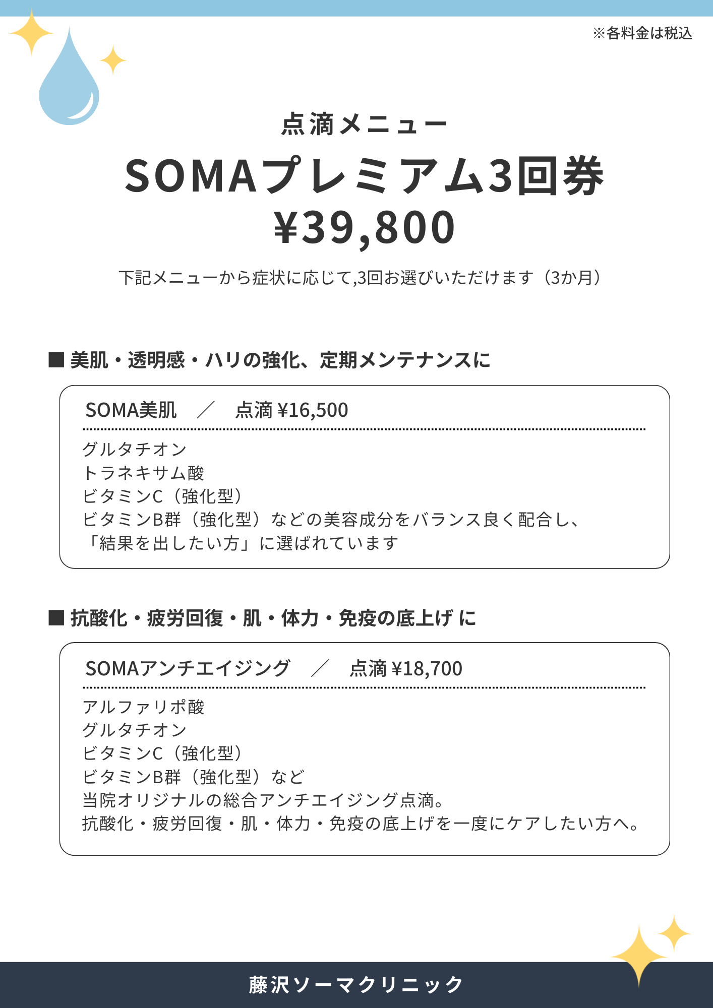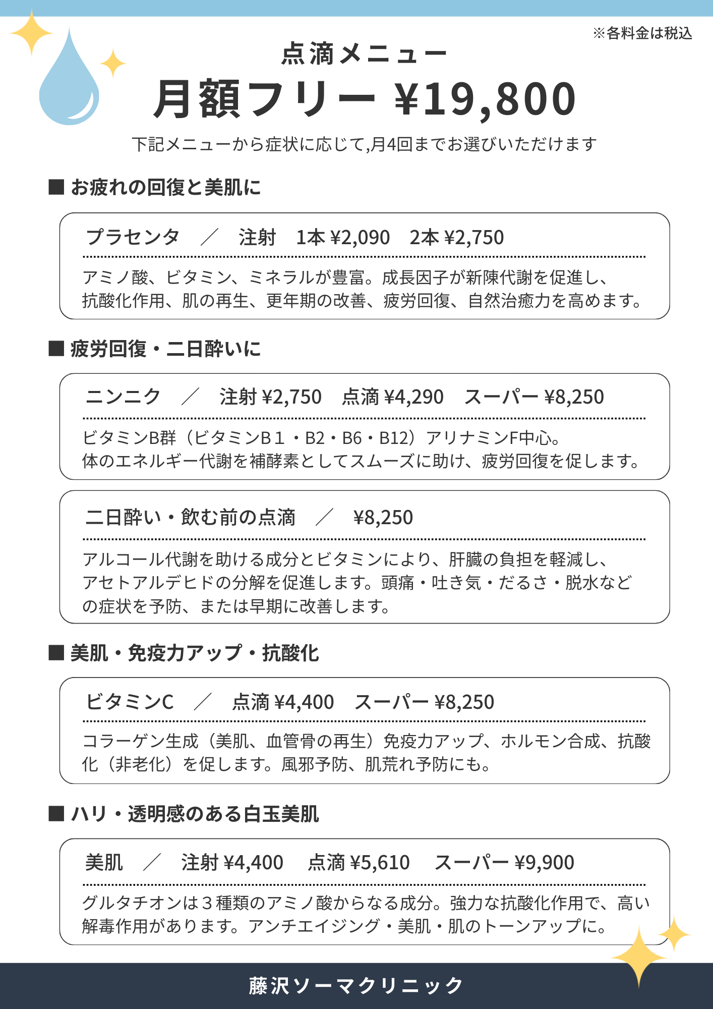 忙しい毎日やストレス、加齢によって、体の回復力や美しさは少しずつ低下していきます。 当院では、医学的に使用実績のある成分を用いた注射・点滴治療により、 疲労回復・美容・免疫サポート・アンチエイジングを目的としたケアを行っています。